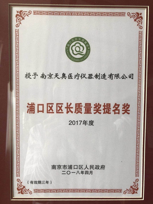 南京天奧醫(yī)療儀器制造有限公司榮獲“2017年浦口區(qū)區(qū)長(zhǎng)質(zhì)量獎(jiǎng)提名獎(jiǎng)”和質(zhì)量強(qiáng)區(qū)工作區(qū)級(jí)“先進(jìn)單位”稱號(hào)。